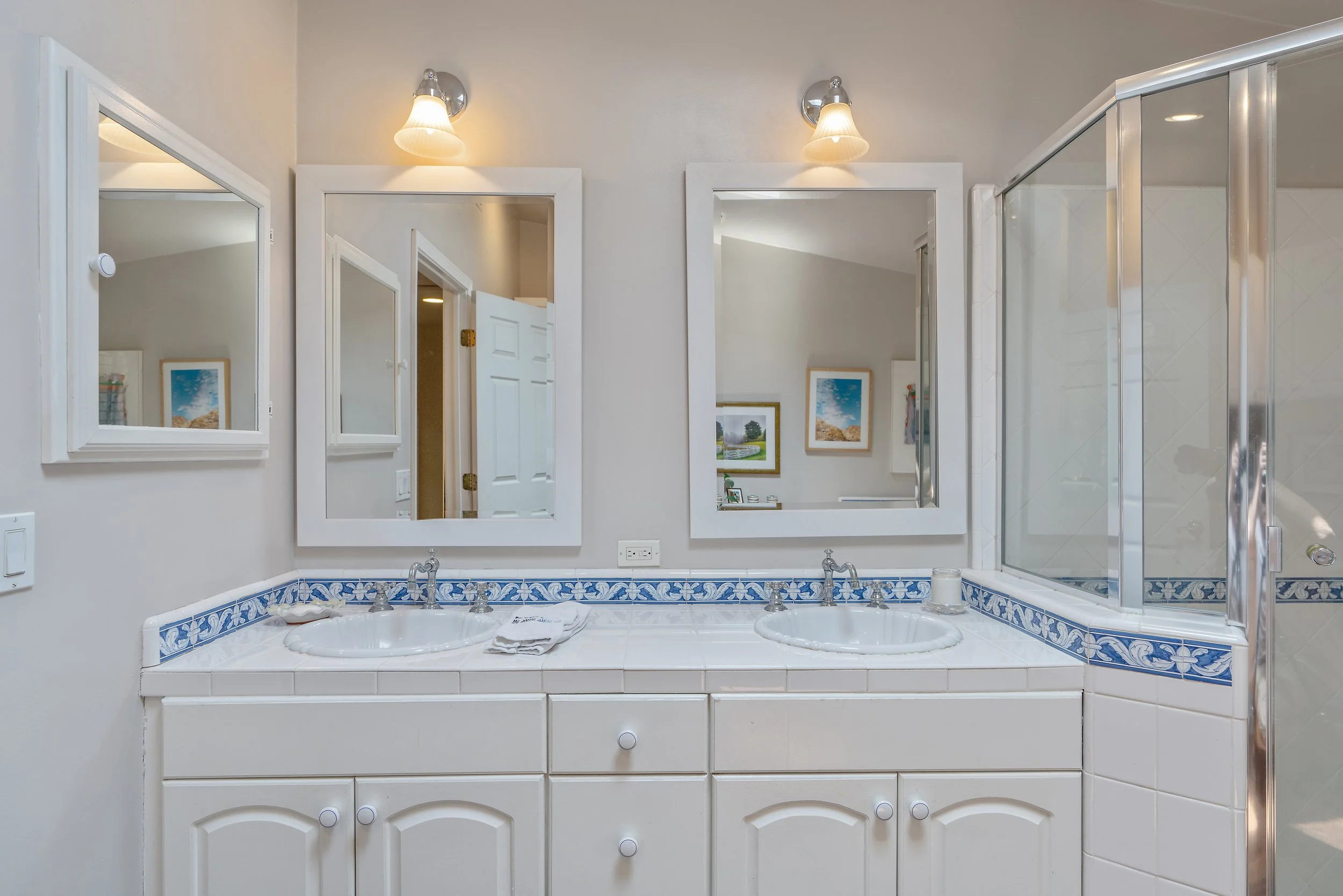 Down a long hallway, you will find three bedrooms and two baths, with the primary bedroom and oversized primary bathroom tucked privately at the rear of the property. A fourth bedroom on the other side of the home features an en-suite bath and is currently set up as a working art studio, with French doors that open to views of the yard and swimming pool.
